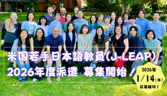 2026年度米国若手日本語教員派遣(J-LEAP)募集2026年度米国若手日本語教員派遣(J-LEAP)の募集を開始しました。 応募締切:2026年1月14日(水曜日) もっと見る