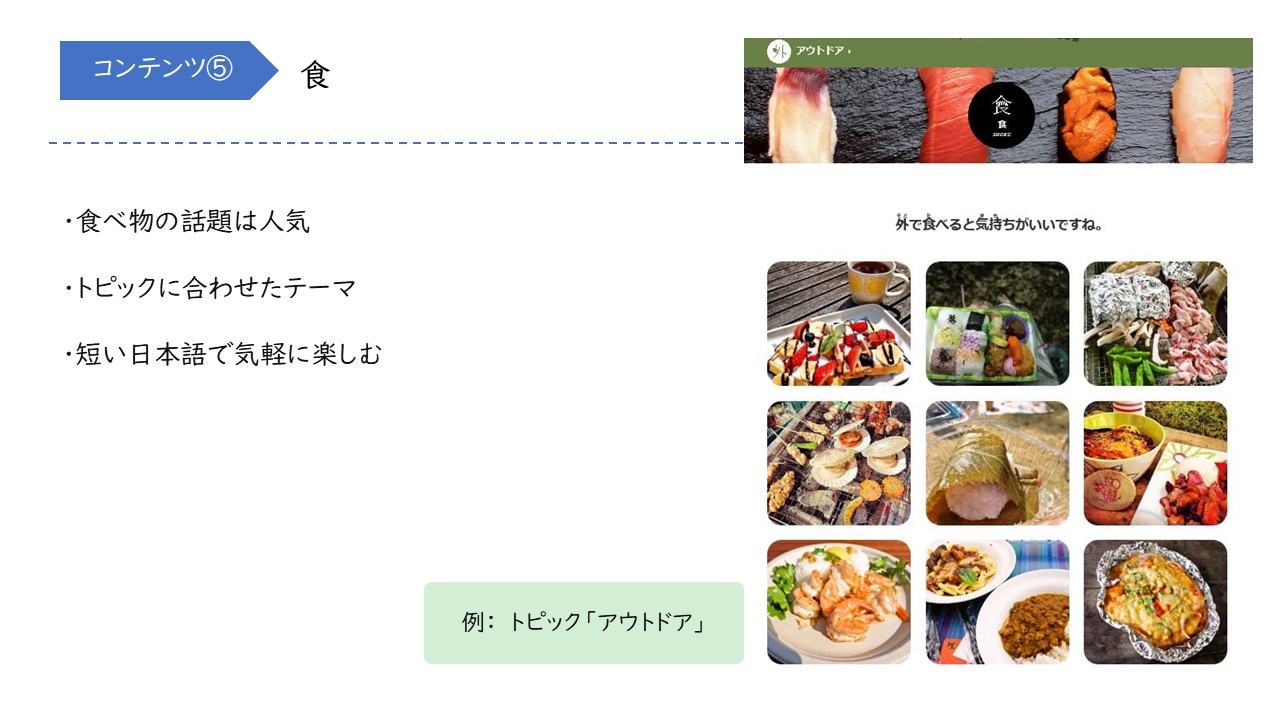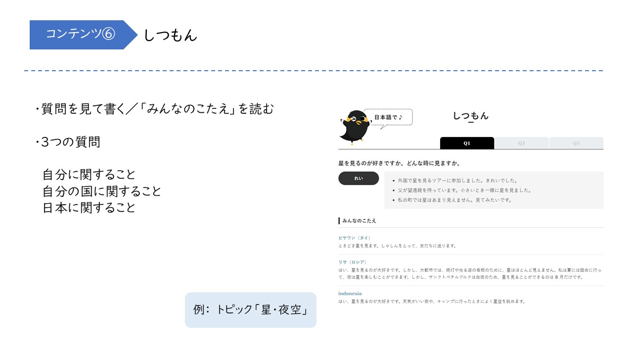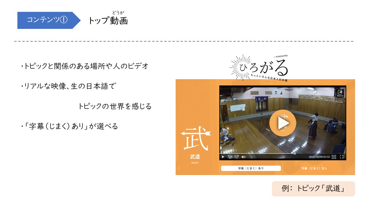 ・トピックは、「星・夜空」「アウトドア」「武道」「カフェ・お茶」「スイーツ」「スーパー・市場」「書道」「アニメ・マンガ」「本・図書館」「寺・神社」「音楽」「水族館」。5,000名を越える世界中の日本語学習者へのアンケートで関心の高かった12のトピックです。