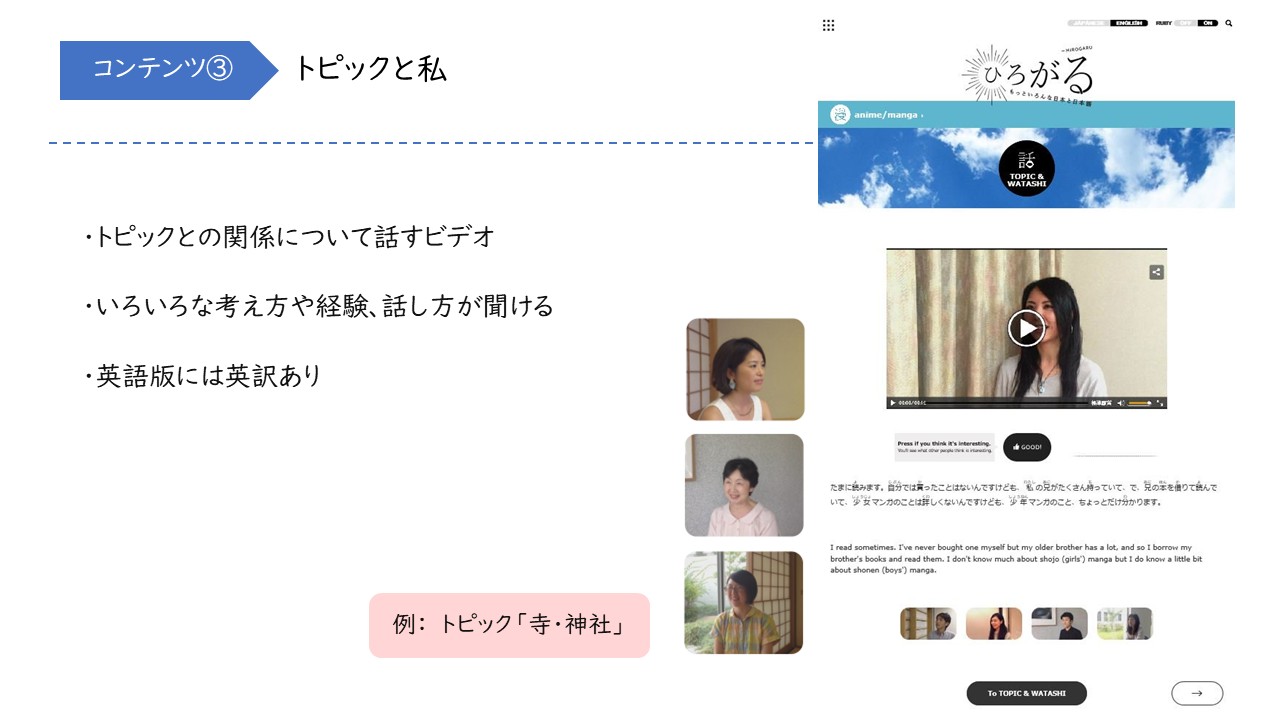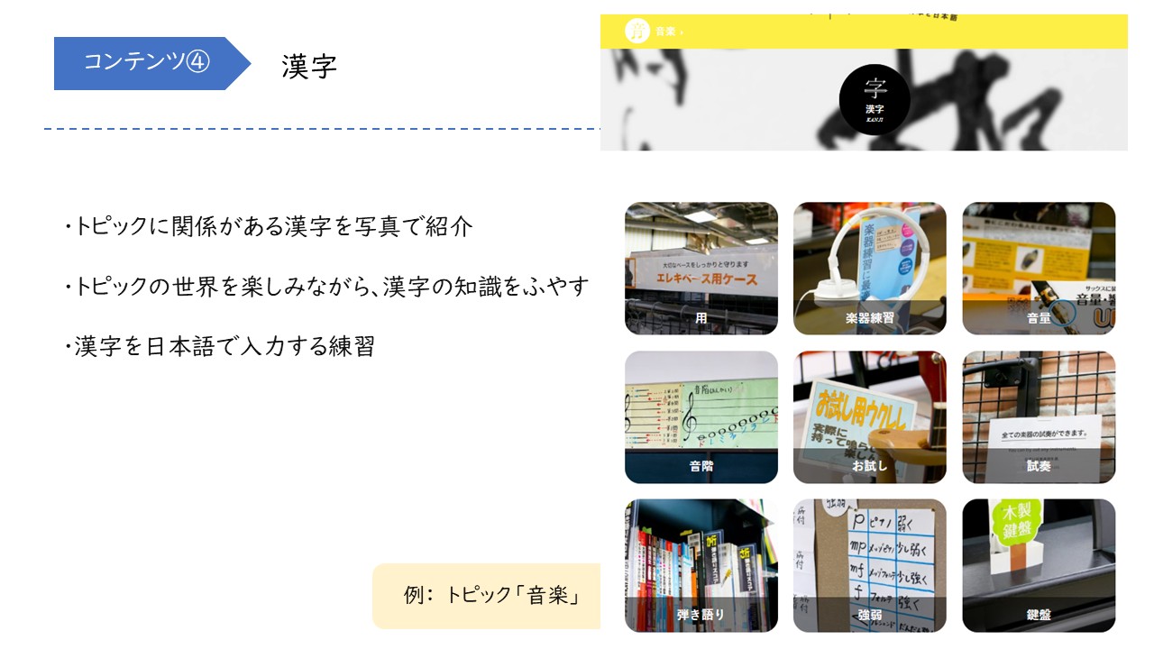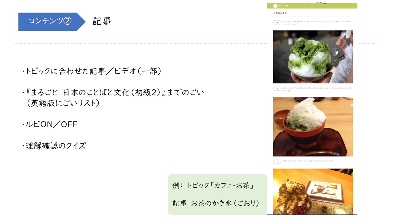 ・JF日本語教育スタンダードのA1、A2レベルの日本語学習者を対象とした、様々なトピックの情報を得ながら楽しく日本語を学ぶことができるeラーニングサイトです。