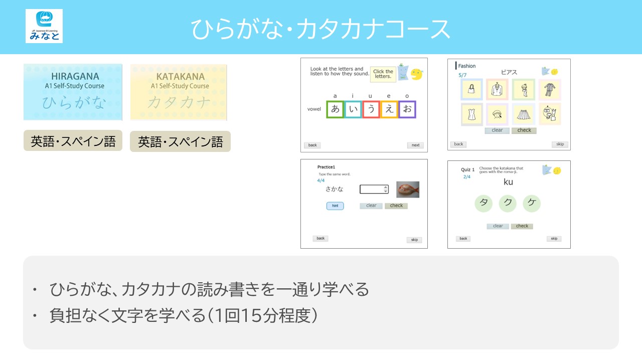 ・「日本語を学びたいけど、近くに教室がない。」「仕事や家事で忙しくて、決まった時間がとれない。」「日本語に興味はあるけど、気軽に学べるところはないかな。」など、「みなと」はそんな人たちにオンラインで日本語コースを提供しています。