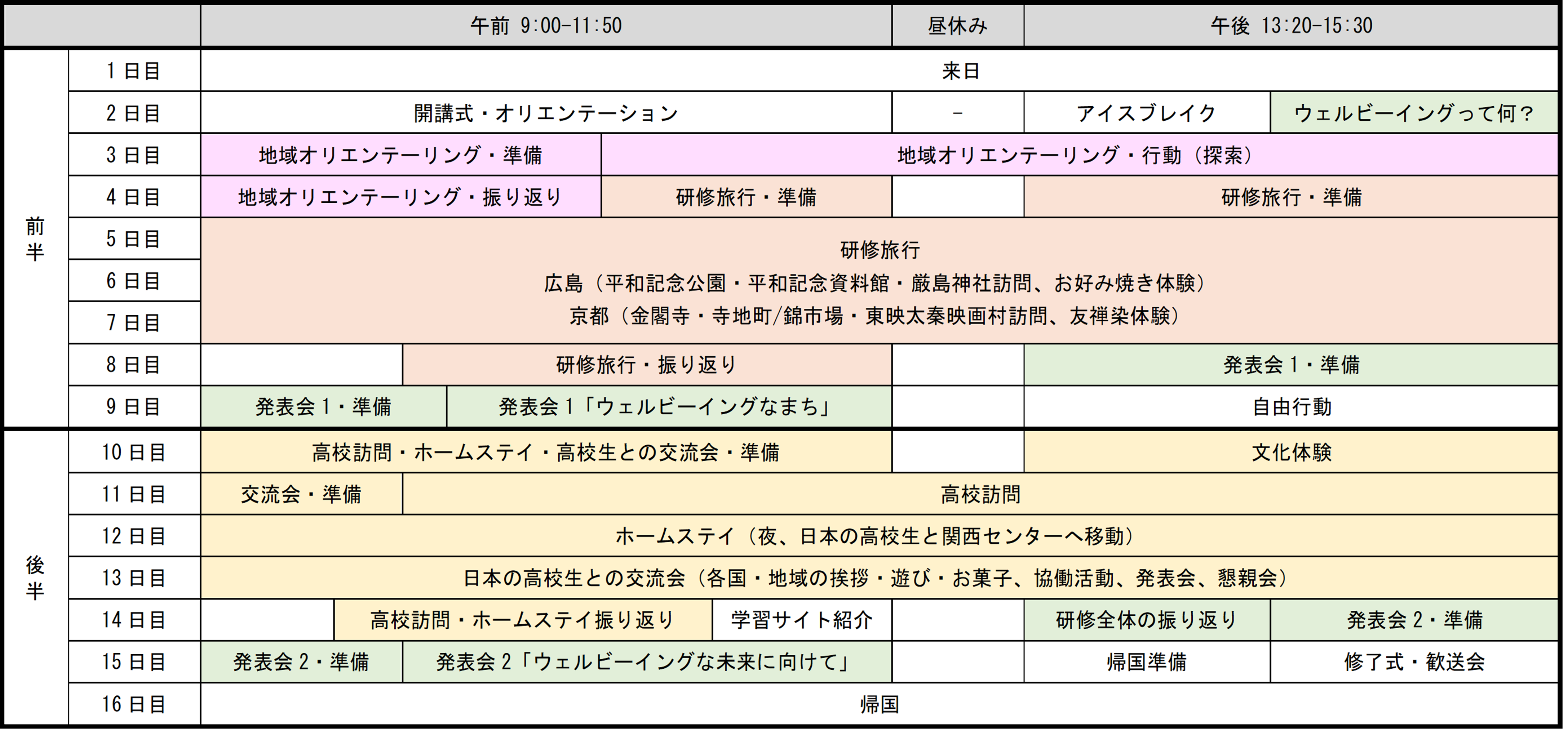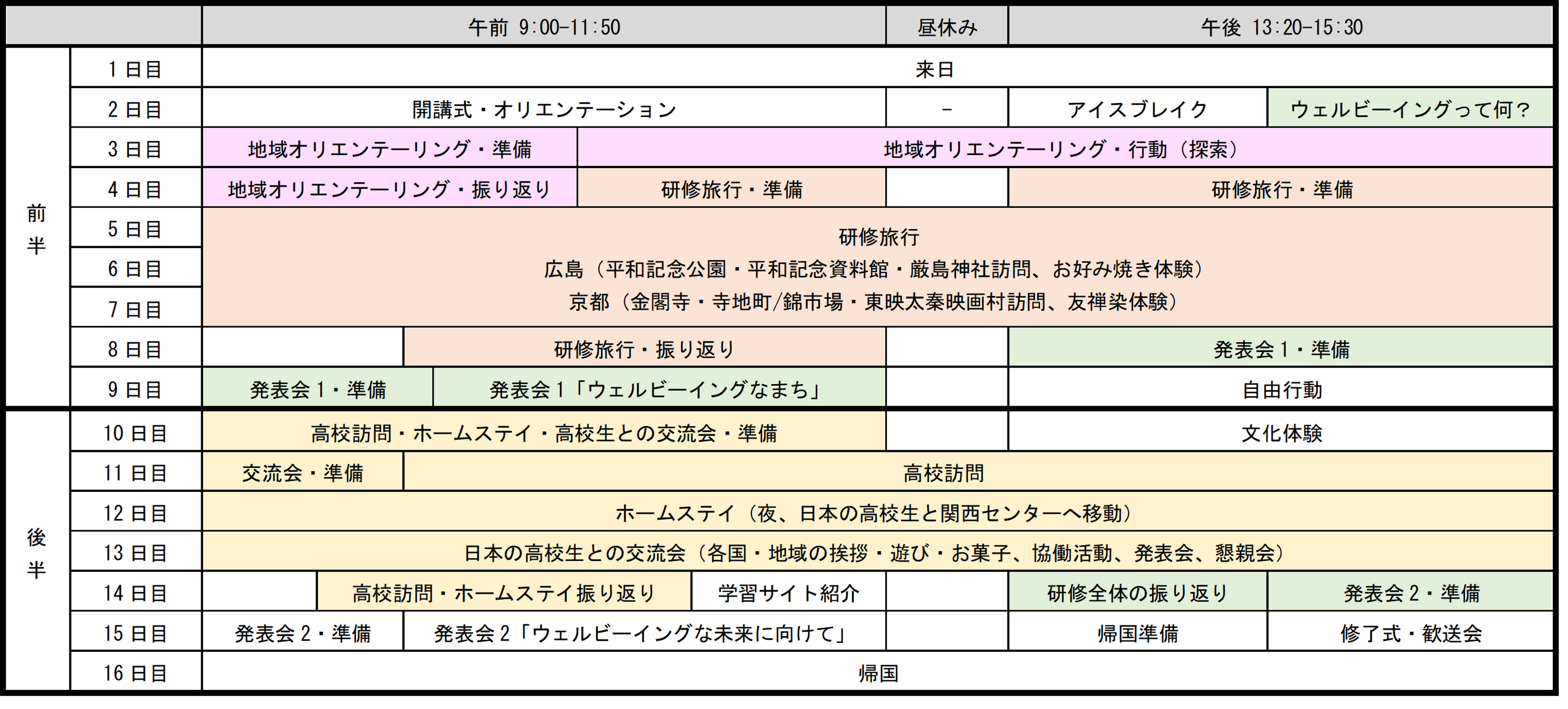 | 15日目 | 発表会2・準備 | 発表会2「ウェルビーイングな未来に向けて」 | 帰国準備 | 修了式・歓送会 | ||