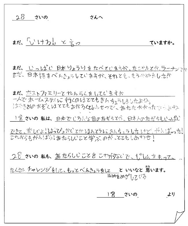 研修の後半は、「高校訪問」や「ホームステイ」、「日本の高校生との交流会」などを実施し、同世代の仲間や日本の人々と交流する中で、相手の意見に耳を傾け、その考えや背景を想像しながら意見交換をしたり、お互いの良さを認め合って協力しながら一緒に活動をしたりするなど相互理解を深められるような活動を行いました。そして、研修の最後には、研修での経験を振り返り、「未来の自分やみんなのしあわせ」に目を向け、10年後どんな社会で、どう生きていたいかを考える活動として、「10年後の私へ」というタイトルで自分宛てに手紙を書きました。このような活動を通して、一人一人が実現したい未来を思い描く力を育める研修となるようにしました。