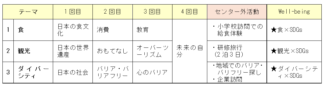 | テーマ | 1回目 | 2回目 | 3回目 | 4回目 | センター外活動 | Well-being | |